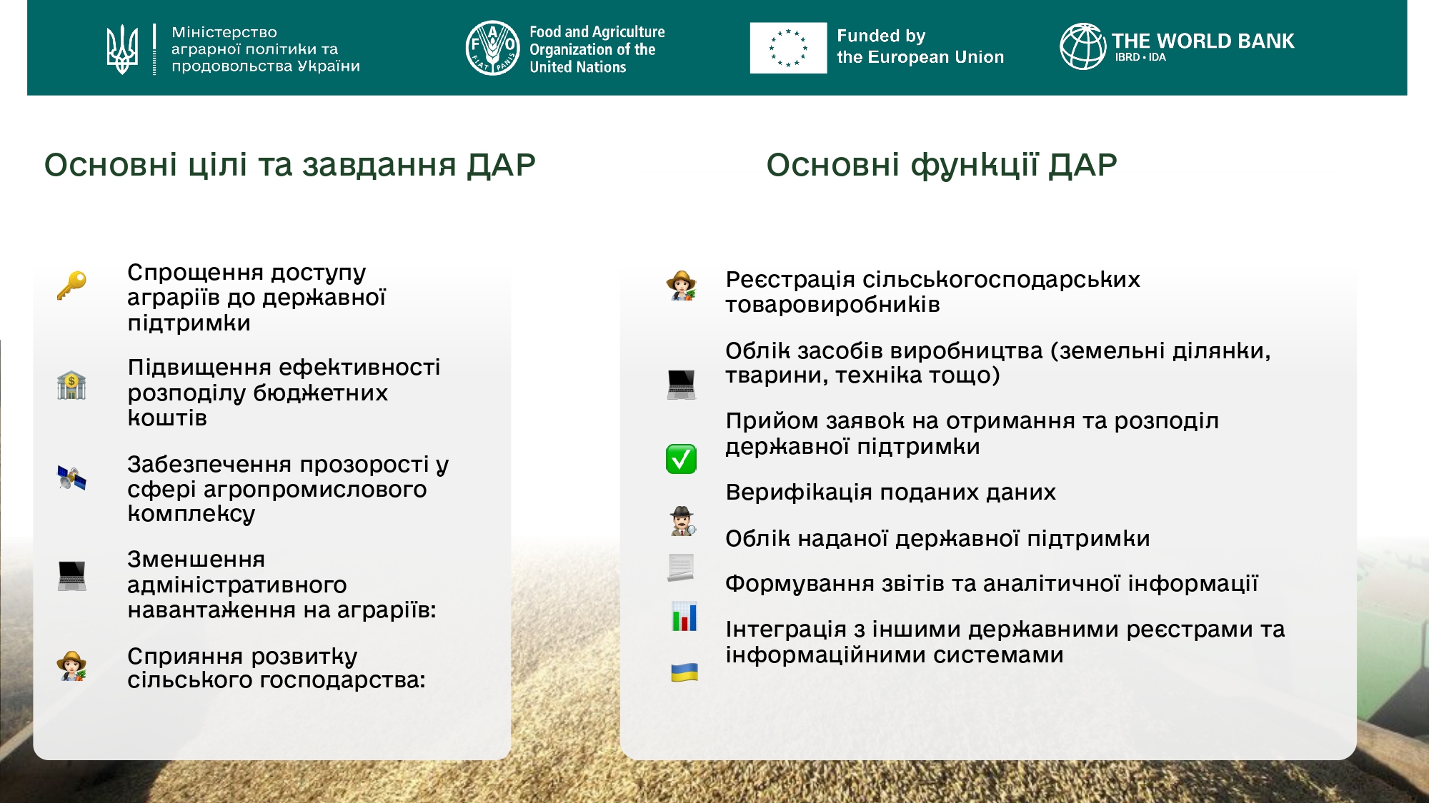 Державний аграрний реєстр – інформаційно-комунікаційна система, що забезпечує збирання, накопичення, інтегрування, зберігання, захист, облік, відображення, оброблення, конфіденційність реєстрових даних, надання та використання реєстрової інформації, надання адміністративних та інших публічних послуг суб’єктам, електронний обмін даними у сферах забезпечення формування та реалізації державної аграрної політики, державної політики у сферах сільського господарства та з питань продовольчої безпеки держави. Станом на травень 2025 року в Державному аграрному реєстрі зареєстровано близько 200 тисяч сільгоспвиробників, серед яких близько 30 тисяч юридичних осіб, близько 148 тисяч фізичних осіб та близько 22 тисяч фізичних осіб підприємців. Державний аграрний реєстр функціонує як ,,єдине вікно” для отримання фінансової підтримки. Система дозволяє аграріям подавати заявки онлайн, відстежувати їх статус та отримувати сповіщення про нові програми. Для отримання всіх видів державної підтримки в агропромисловому комплексі реєстрація в Державному аграрному реєстрі є обов'язковою умовою. Через Державний аграрний реєстр агровиробники отримують доступ до різноманітних програм підтримки, зокрема: підтримка на гектар оброблюваної землідотації на утримання корів, овець і кіз; спеціальні програми для господарств з деокупованих і прифронтових територій; дотації на реконструкцію або будівництво зрошувальних мереж; програми допомоги від Продовольчої та сільськогосподарської організації ООН (ФАО), ЄС та інших донорів — зокрема розподіл насіння, добрив, обладнання та надання грантів.
