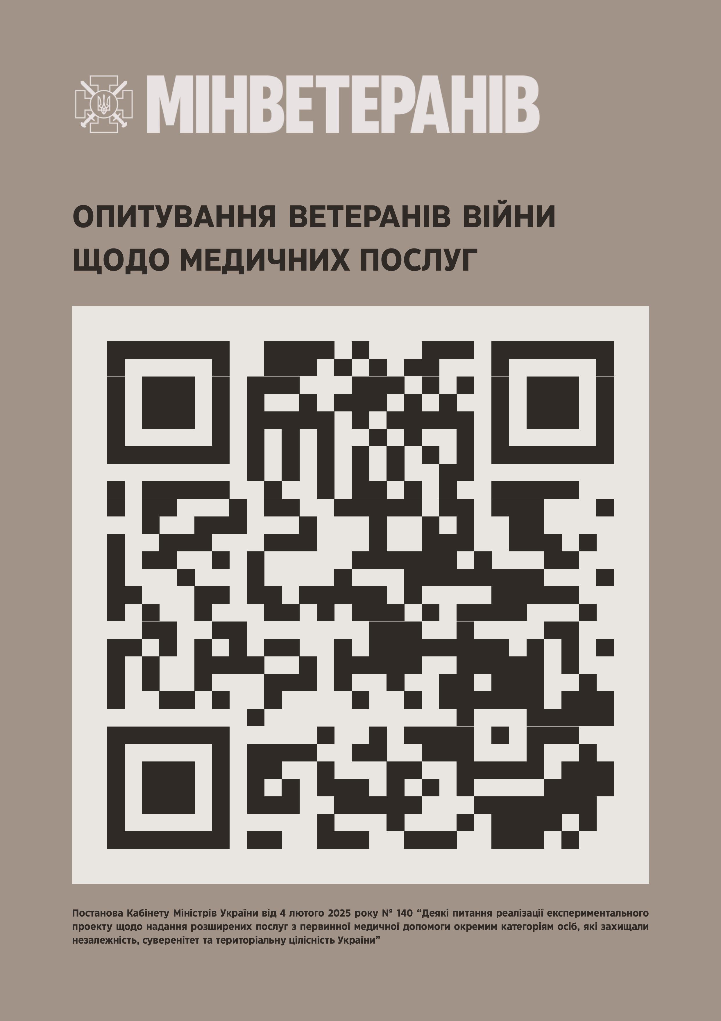 Міністерство у справах ветеранів України проводить опитування серед ветеранів війни щодо якості медичних послуг, які надаються в межах експериментального проєкту з розширення первинної медичної допомоги.